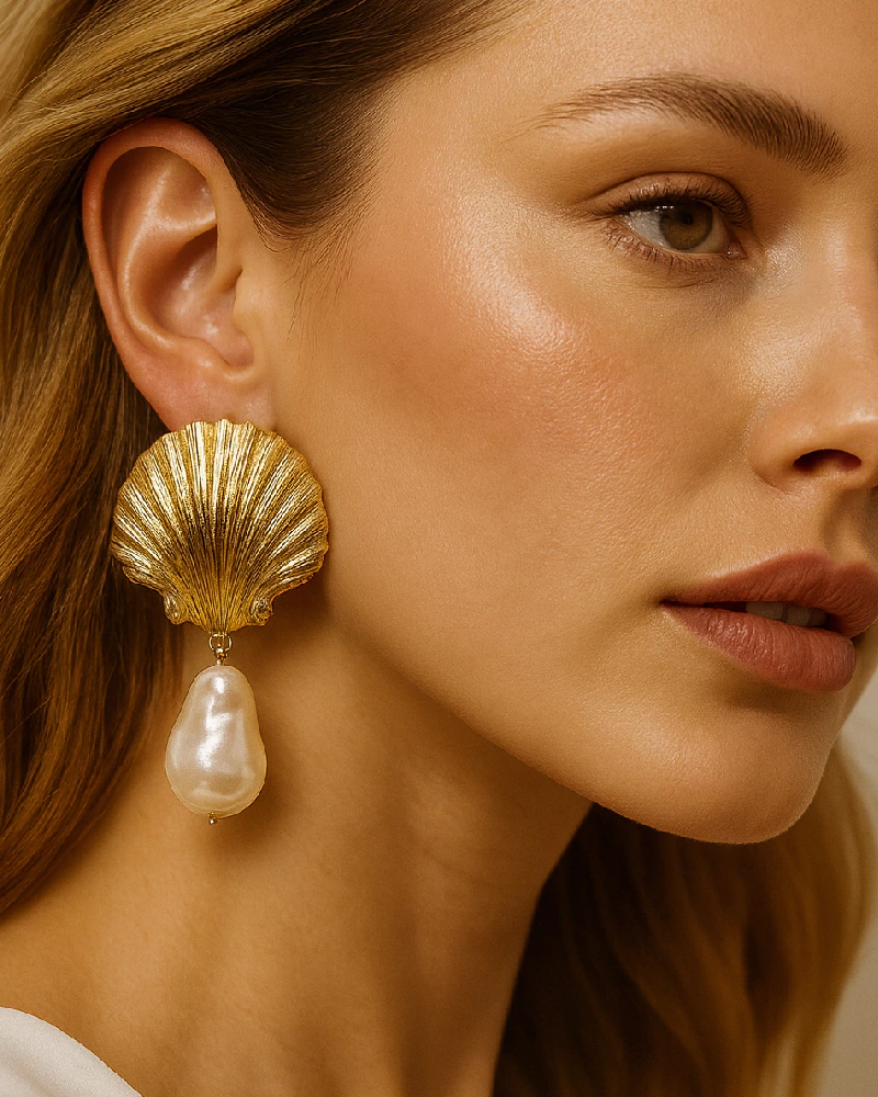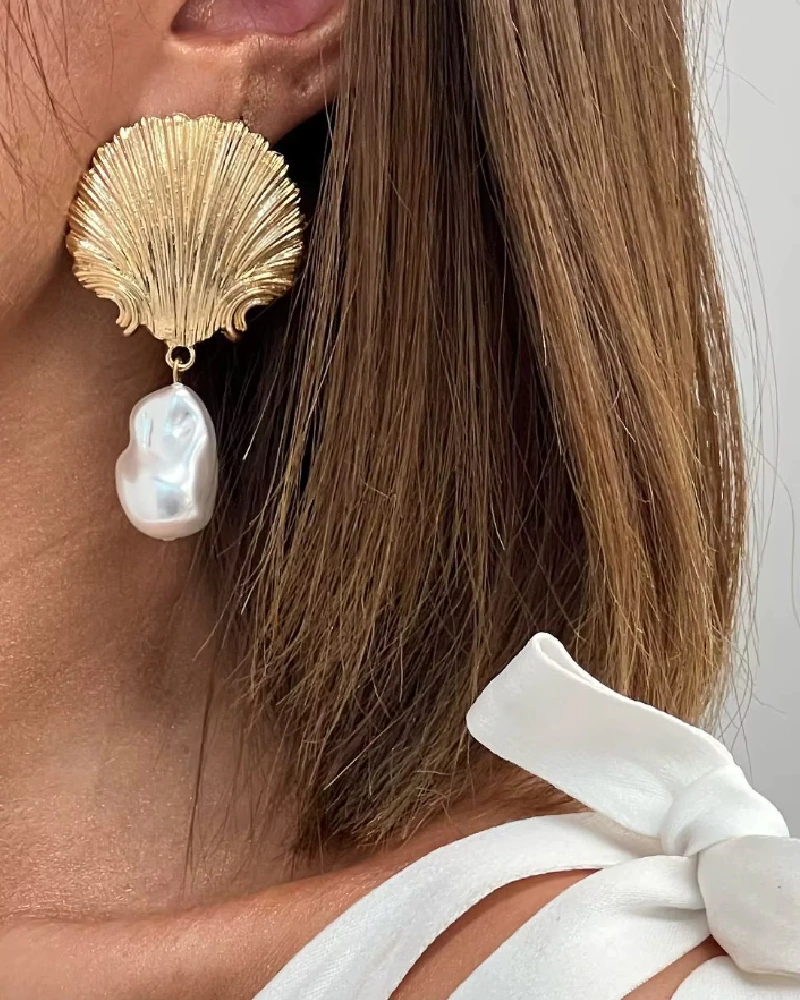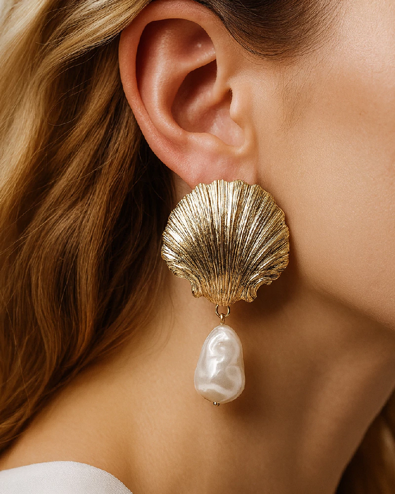 Brinco em metal dourado com design vintage, inspirado em conchas do mar, adornado com uma pérola barroca simulada. Uma peça clássica e sofisticada, que adiciona charme atemporal ao visual. Ideal para quem procura um acessório elegante com toque retrô.