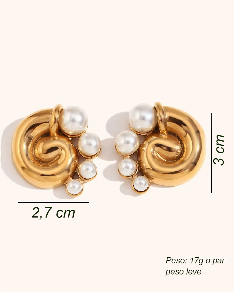 O brinco é feito em liga de zinco com acabamento dourado e pérolas simuladas. Não possui banho hipoalergênico.