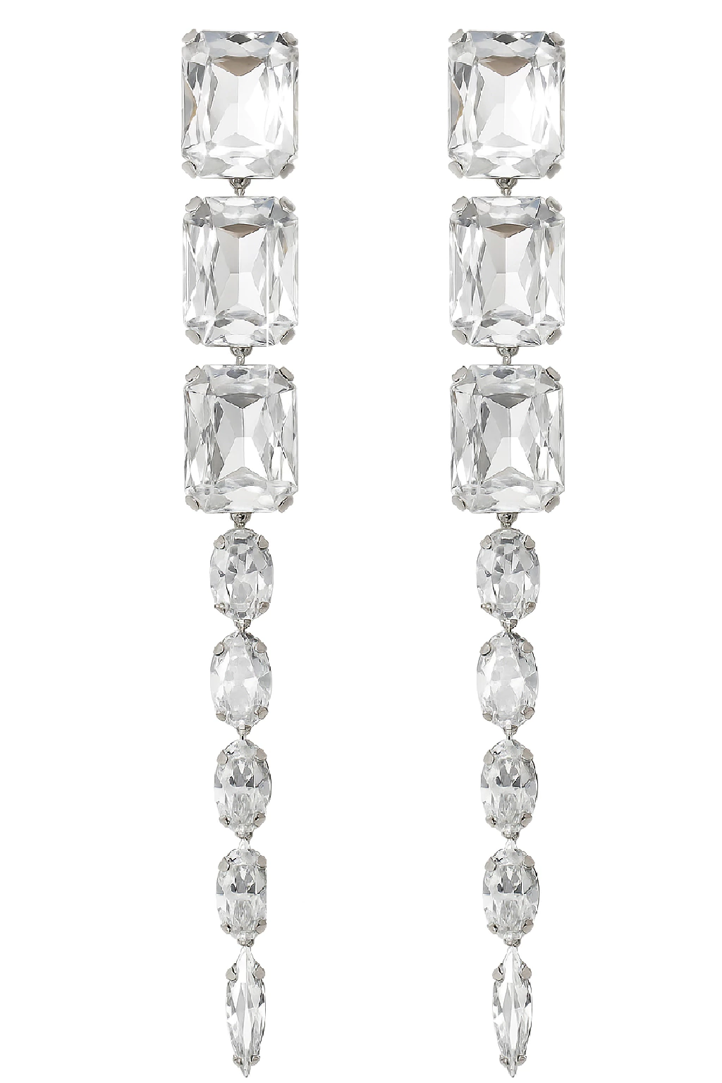 • Estrutura: brinco em metal prateado, design longo com 14 cm com aplicação de cristais retangulares e ovais, uma peça brilhante e esplêndida, perfeita para arrematar o look festa com muita elegância e glamour