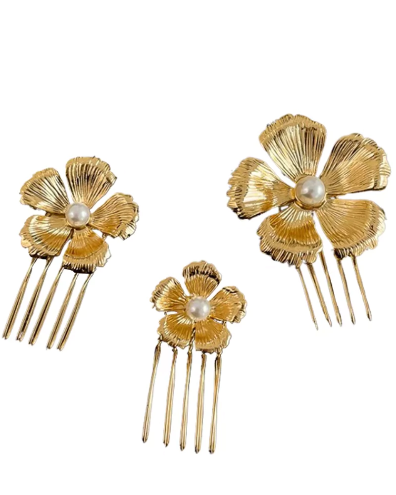 Conjunto com 3 grampos em metal dourado, finalizados com flores ricamente texturizadas e pérolas centrais simuladas. Perfeitos para quem deseja adicionar um toque sofisticado ao penteado, seja para casamentos, formaturas ou eventos especiais. Os grampos Monet são delicados, leves e têm um visual luxuoso e romântico. Ideal para noivas que procuram elegância com um acabamento impecável.